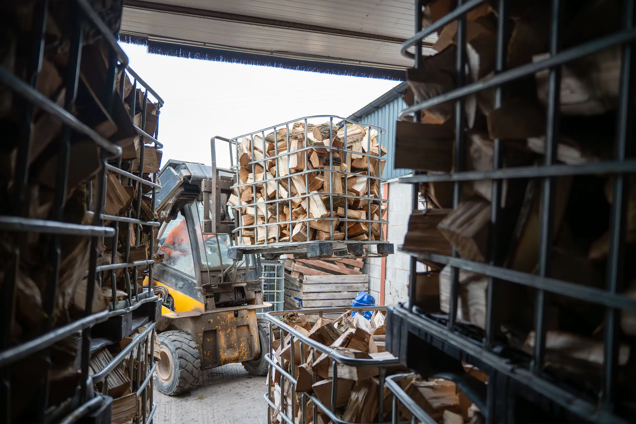 Each log is precision cut and split to the ideal size for most wood burners. The pieces are then loaded into large metal crates — just like the ones you’ll see at our Buxton site — ready for drying. This even sizing allows consistent airflow inside the kiln, which is key to a uniform moisture level.
